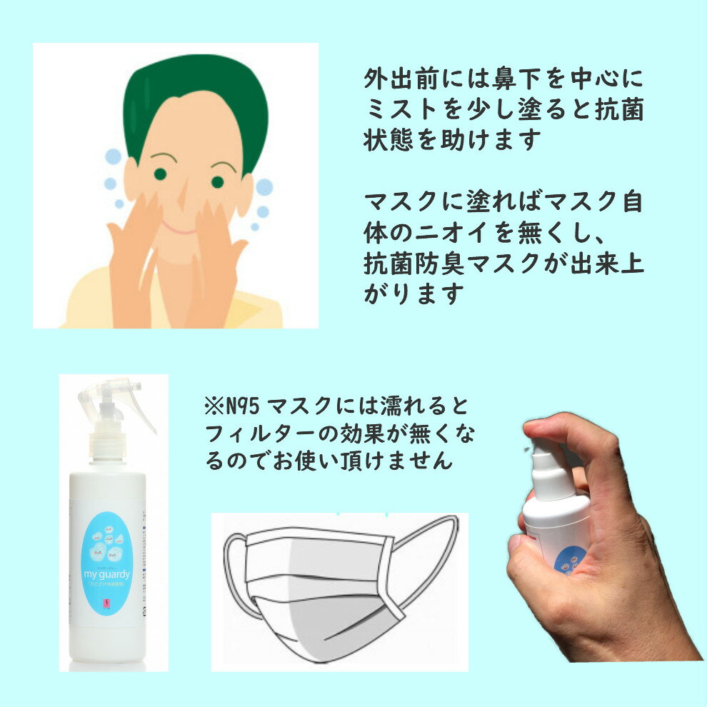 ※N95マスクにはお使い頂けません マイガーディーは塩素 アルコールフリー 成分は銀 チタン 亜鉛のトリプル金属イオン水と酸化チタンのみ。