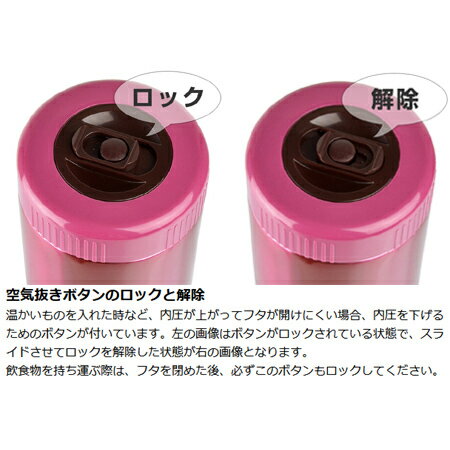 ブラックブラウンレッド空気抜きボタンのロックと解除温かいものを入れた時など、内圧が上がってフタが開けにくい場合、内圧を下げるためのボタンが付いています。