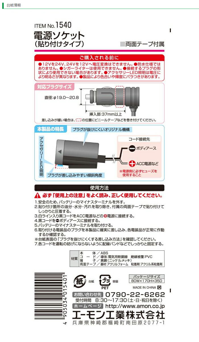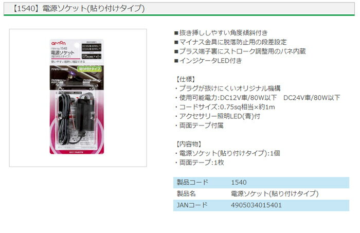 【3%OFFクーポン配布中】1540 電源ソケット(貼り付けタイプ) エーモン工業 使いやすい箇所に増設できる電源ソケット コンビニ受取対応