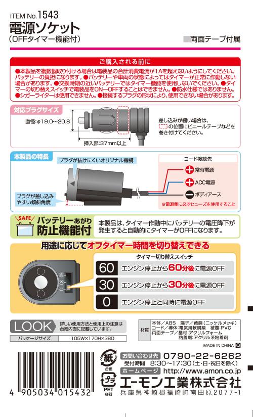 商 品 詳 細 商品説明 ◇[エーモン]電源ソケット OFFタイマー機能(1543) ■エンジン停止後も電装品が一定時間(60分/30分/0分)使用できる電源ソケット ■抜き挿ししやすい角度傾斜付き 【仕様】 ・オフタイマー時間を切り替えできる 60分/30分/0分 ・使用可能電力:DC12V車/12W以下 DC24V車/使用不可 ・コードサイズ:0.5sq相当×約1m ・両面テープ付属 【内容物】 ・電源ソケット(OFFタイマー機能付):1個 ・両面テープ:1枚 納 期 ・メーカー取り寄せ商品になります。